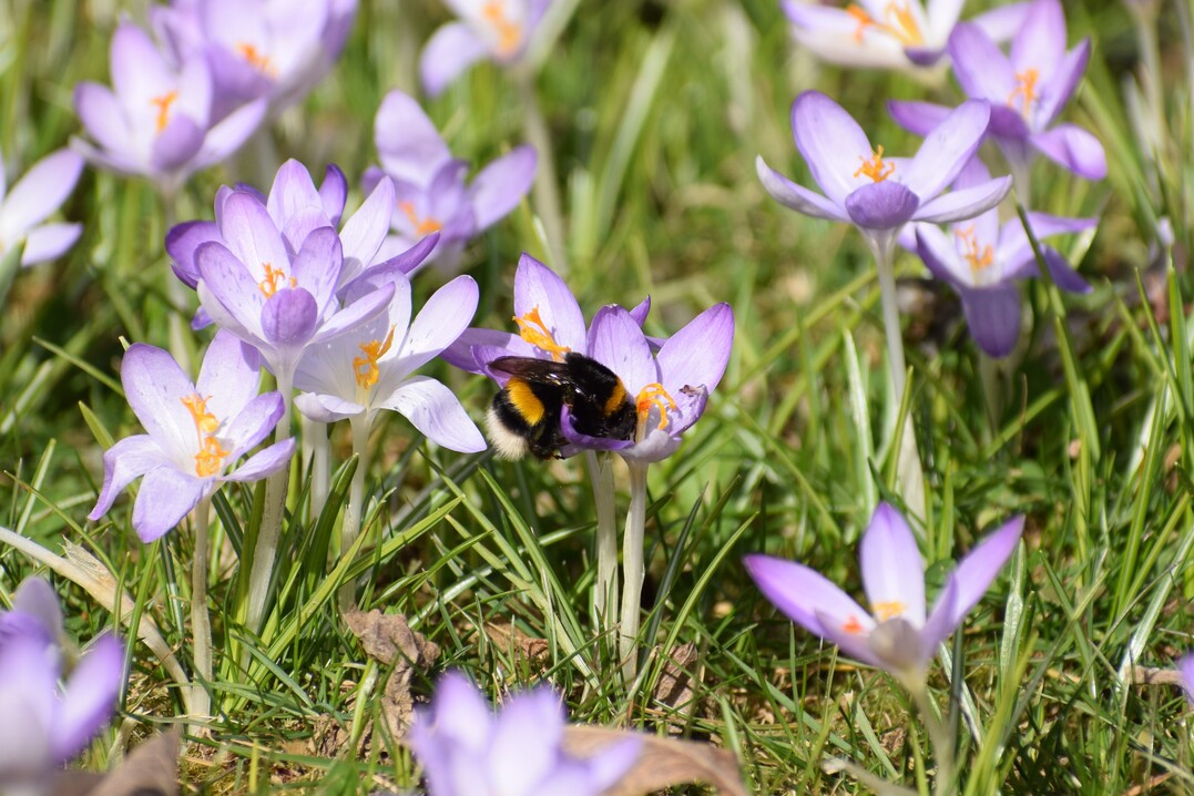 Nun braucht die Erdhummel dringend Nektar. Dabei ist sie nicht wählerisch, sie besucht die Blüten der Krokusse genauso wie Winterlinge und andere Frühblüher. Auch später im Jahr sind sie an verschiedensten Pflanzenarten zu beobachten.