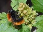 Zu den wohl auffälligsten Wildbienen, die derzeit in vielen Gärten zu entdecken ist, zählt die Fuchsrote Lockensandbiene (Andrena fulva), auch Rotpelzige Sandbiene genannt. Die Weibchen der Art sind schwarz und tragen auf Thorax und Hinterleib einen leuchten fuchsroten, dichten Pelz. Besonders häufig fliegen sie Stachelbeeren und Johannisbeeren an, aber auch viele andere Arten werden gerne angenommen.