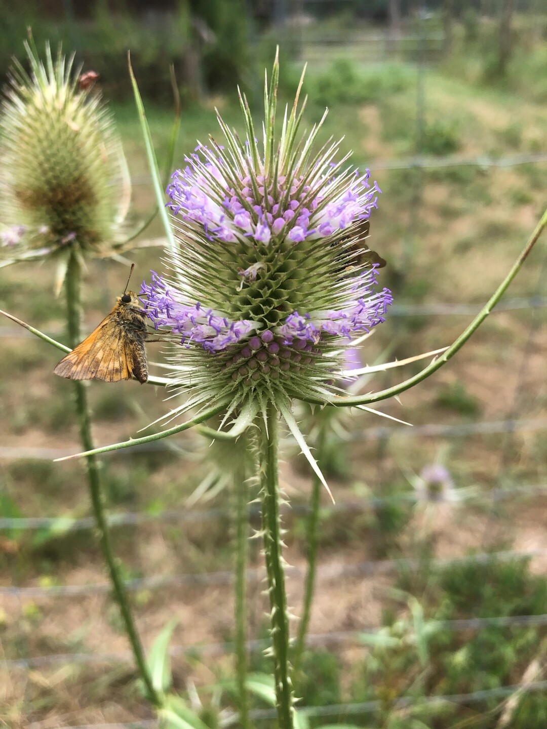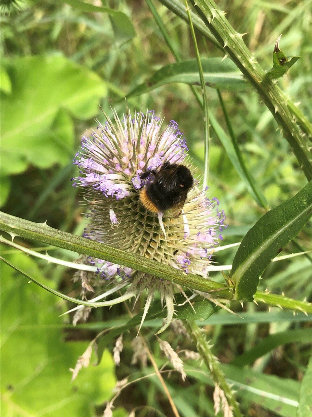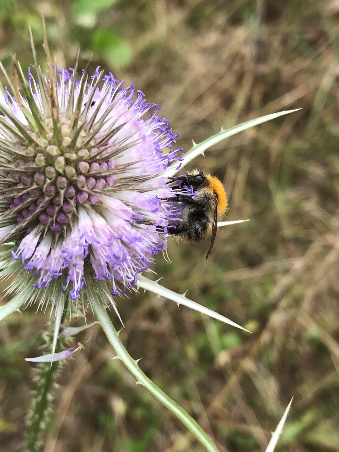 Eine Bienenweide par excellence ist die Wilde Karde. Hier sammeln verschiedene Hummeln und Schmetterlinge, aber auch zahlreiche andere Insekten ihren Nektar. Innerhalb von nur wenigen Minuten sind uns hier die Ackerhummel, der Rostfarbene Dickkopffalter und die Wiesenhummel vor die Linse geflogen. Erdhummel und Kaisermantel waren zu schnell für unseren Auslöser...