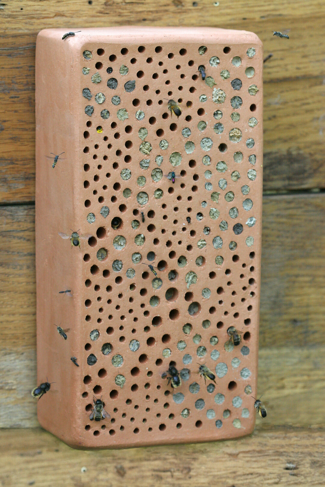 Wildbienensteine sind getöpferte Steine mit Löchern. Diese sind nicht durchgängig, sondern hinten verschlossen, sodass sie optimal besiedelt werden können. Je nach Art braucht es verschieden große Löcher - so fühlen sich Mauerbienen, Blattschneiderbienen und Co. schnell wohl.