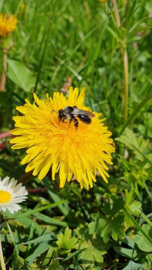 Nachdem der letzte Schnee des Aprils weggetaut ist, ist die Graue Sandbiene eine der ersten Wildbienen, die wieder von Blüte zu Blüte fliegt. Die etwa honigbienengroße Art ist momentan an vielen Blüten zu sehen - als polylektische Wildbiene sammelt sie ihren Pollen beispielsweise an Löwenzahn, Wiesenschaumkraut, verschiedenen Weiden, Hahnenfuß und Ehrenpreis.
