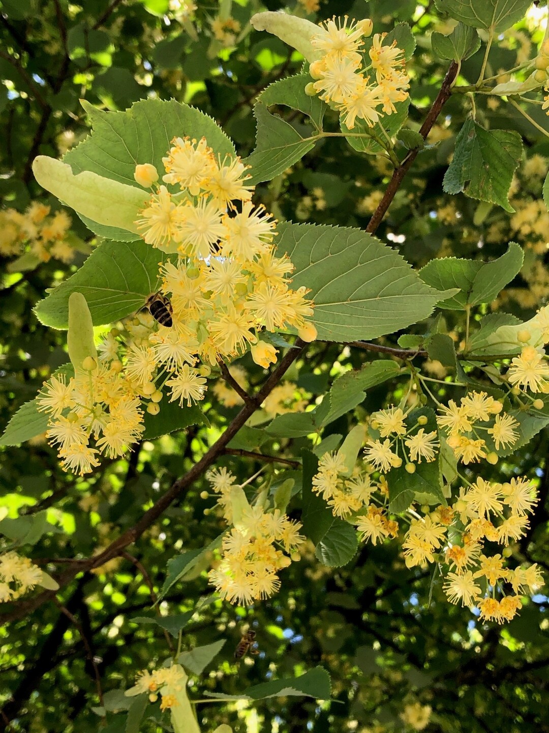 Für Honigbienen, aber auch für viele Hummeln sind Linden im Juni ein besonderer Anziehungspunkt. Zum Anfang der Blütezeit bieten die gelblichen Blüten der Bäume sehr viel Nektar. Neben Hummeln sammeln auch einzelne Wildbienen hier Nektar und Pollen.