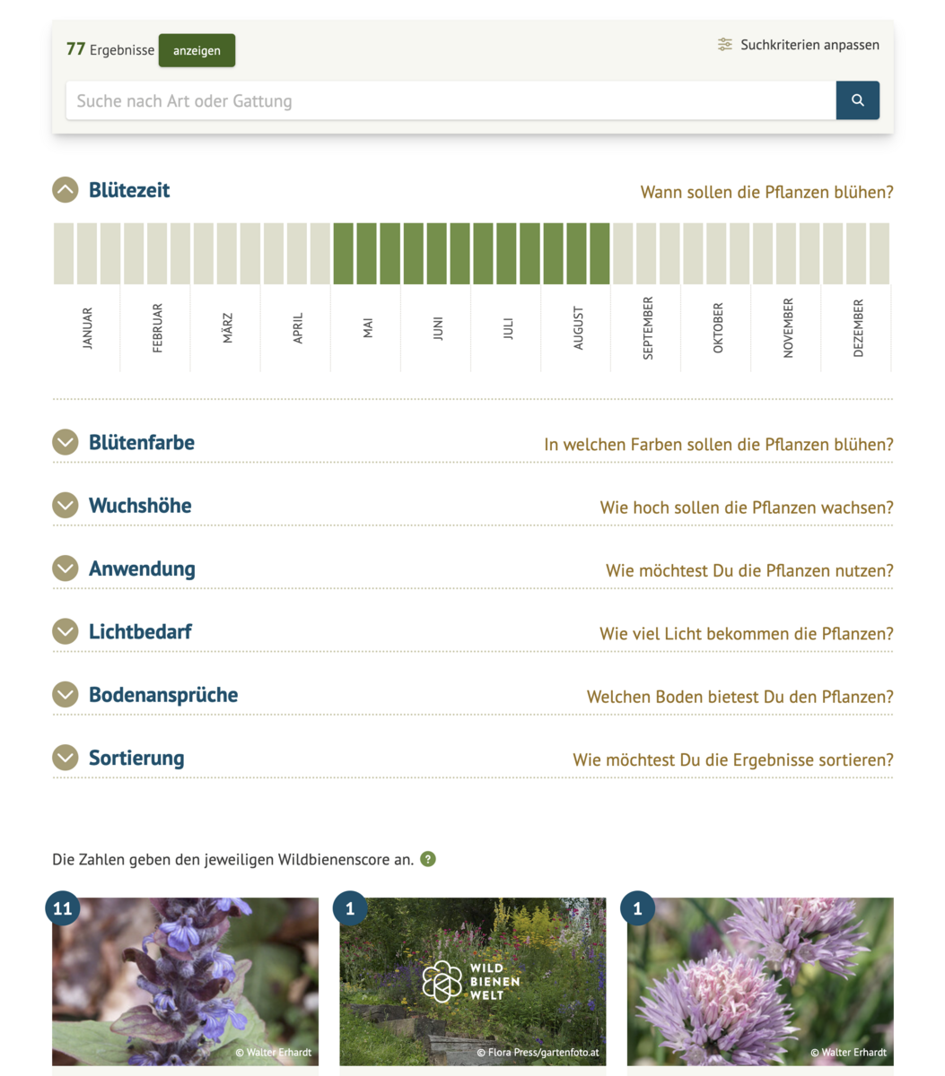 Hier findest du bienenfreundliche Pflanzen für Deinen Garten oder Balkon. Dabei zeigt dir unser Wildbienenscore an jeder Pflanze auf einen Blick, wie viele Bienenarten diese Pflanzen als Pollenquelle nutzen.