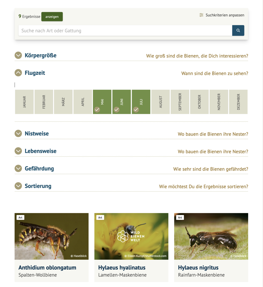 Mit dem Wildbienenfinder wählst du aus mehr als 560 Arten genau die richtigen aus, die zu deinen Beobachtungen passen. Alle Merkmale lassen sich kombinieren – und die Ergebnisliste wird sofort dynamisch angezeigt.